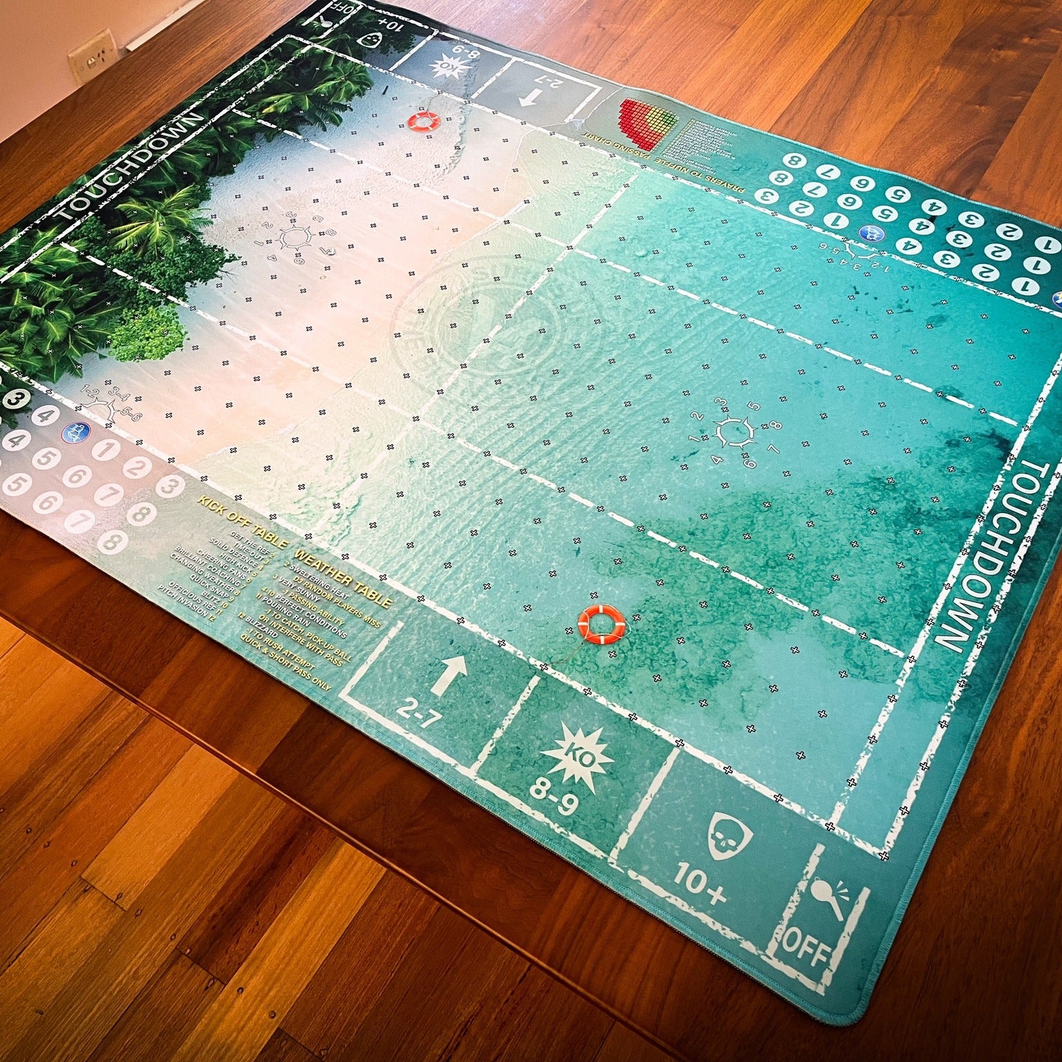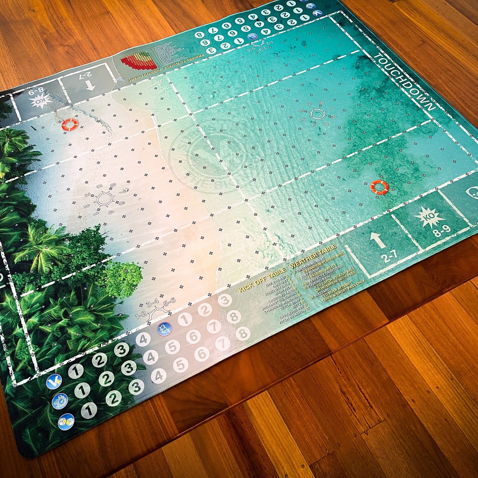 Dive into the ultimate Blood Bowl experience with this stunning official tournament mat, exclusively designed by Johnny Wilkinson for The Big V 2025! This tropical paradise-themed pitch transforms your gaming table into a breathtaking beachside arena where the azure waters meet pristine sandy shores.